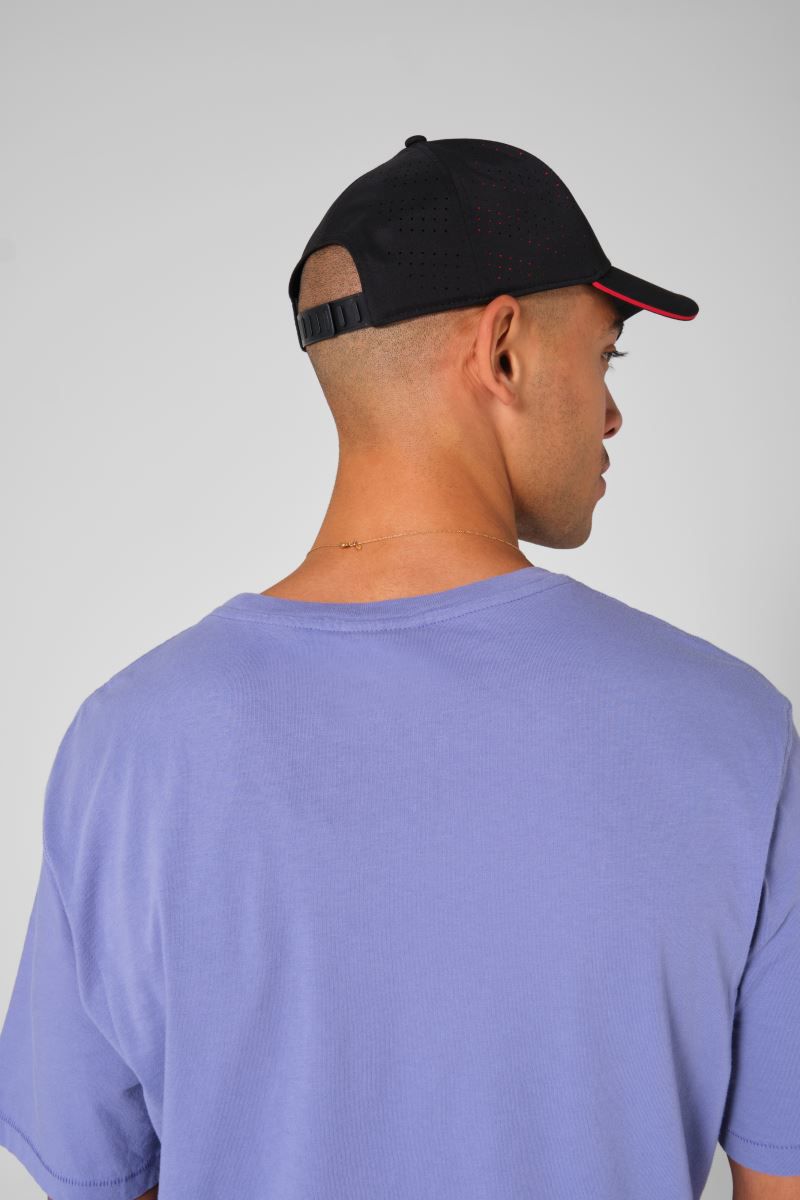 Gebogener Schirm, Sandwich in Kontrastfarbe, Futter in Kontrastfarbe, weiches Schweissband, Frontpanele verstärkt, gelaserte Luftlöcher, Snapverschlussm (Kunststoffverschluss), feuchtigkeitsregulierend, Tear Away Label, nur mit einem Schwamm reinigen, nicht waschen