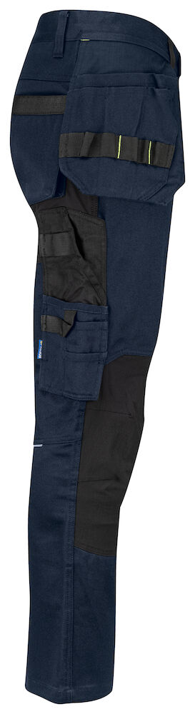 Geräumige Beintaschen auf beiden Seiten. Linke Beintasche für Werkzeug und Schreibgeräte, sowie eine Handy-Tasche mit Magnetverschluss und Schlaufe für ID-Kartenhalter. Auf der rechten Seite eine Metertasche und eine Werkzeugtasche mit Messerknopf. Vorgeformte Knie. Innentaschen für Knieschutz, in zwei Höhenstufen verstellbar.