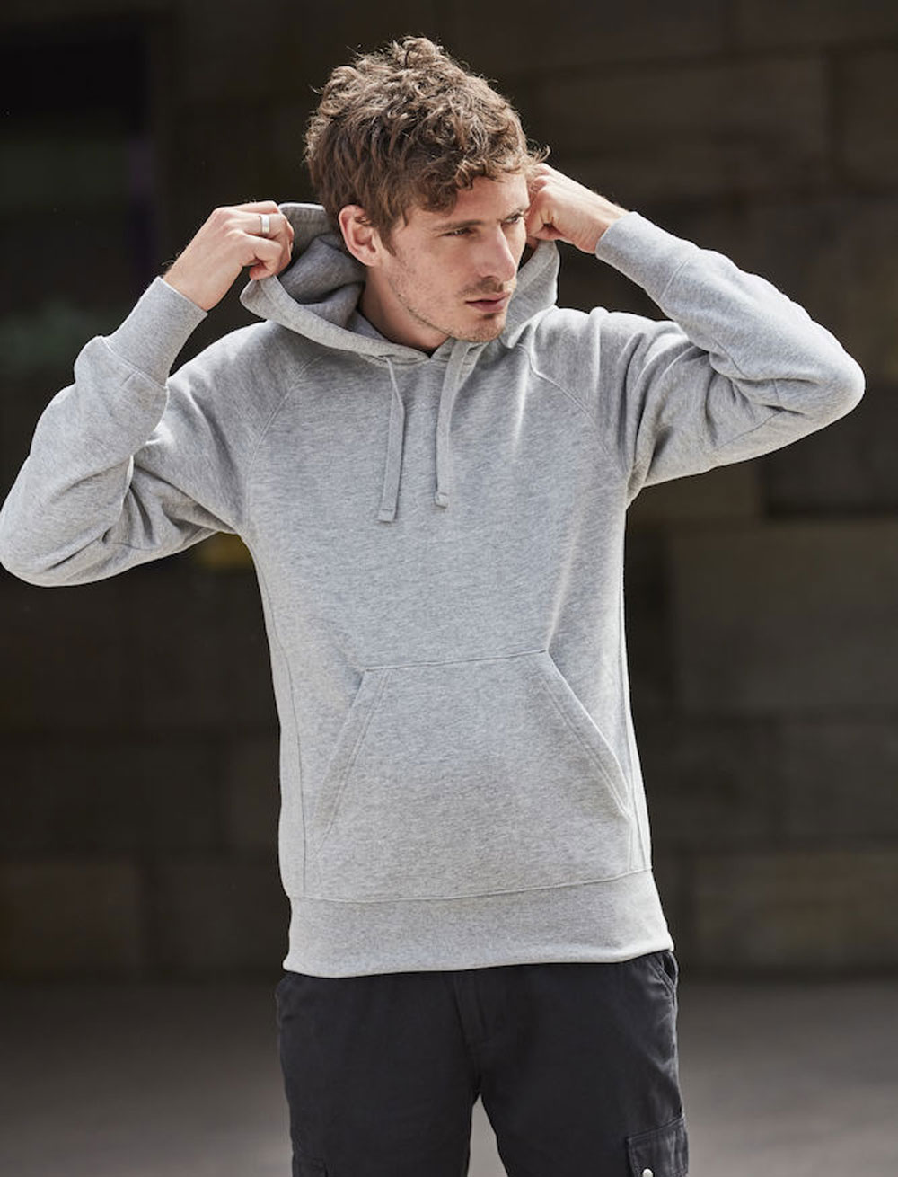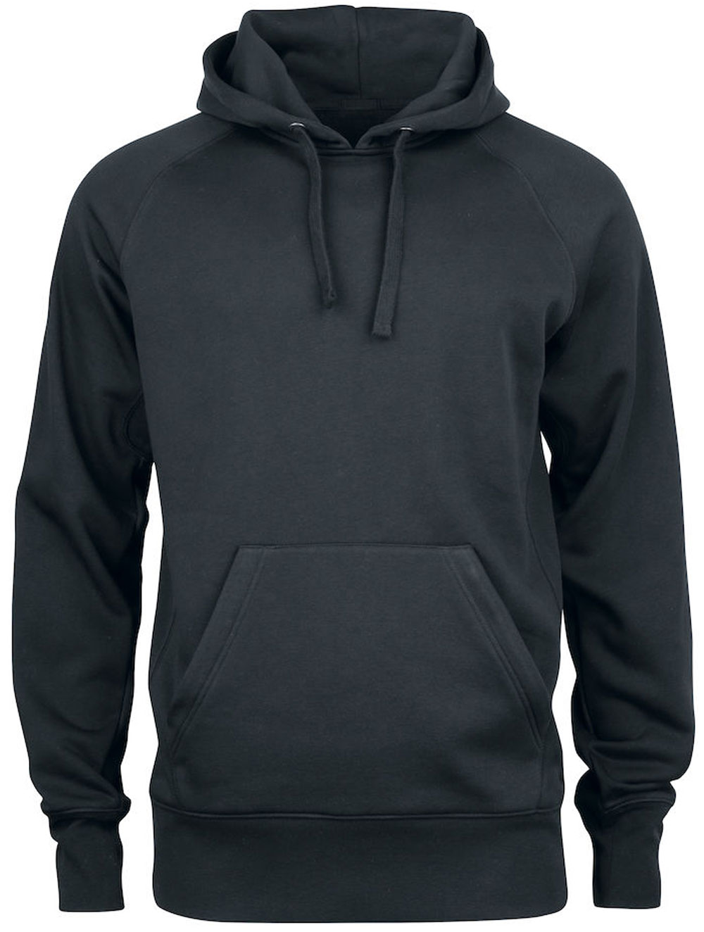 Kängurutasche und eine versteckte Tasche in der Seitennaht. Raglan-Ärmel und 2x2 Elasthan-Rippen an den Seiten, Bündchen und am unteren Saum. Rustikale Metallöse für einen flachen Kordelzug.