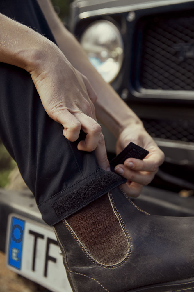 Strapazierfähiges, wind- und wasserabweisendes Material in stark beanspruchten Bereichen. Gummizug in der Taille und vorgeformte Knie für bessere Bewegungsfreiheit. Option zum Einsetzen von Knieschonern. Zwei Vordertaschen, zwei Beintaschen mit Reissverschluss und eine auf der Rückseite. Verstellbarer Beinabschluss mit Gummizug und Klettverschluss.
