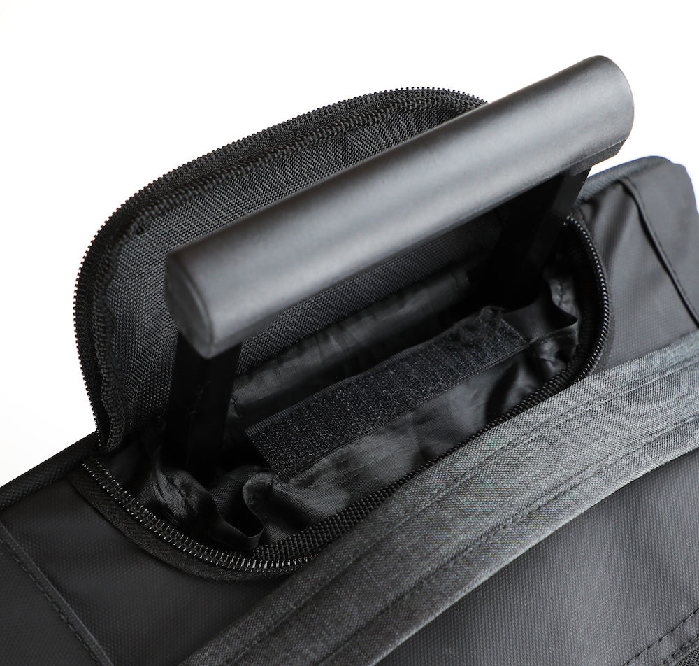 Zwei Räder und eine Standlösung machen ihn leicht und wendig. Der Teleskopgriff kann zum Schutz in einem Reissverschlussfach versteckt werden.