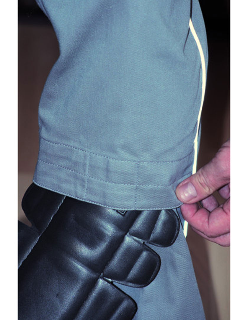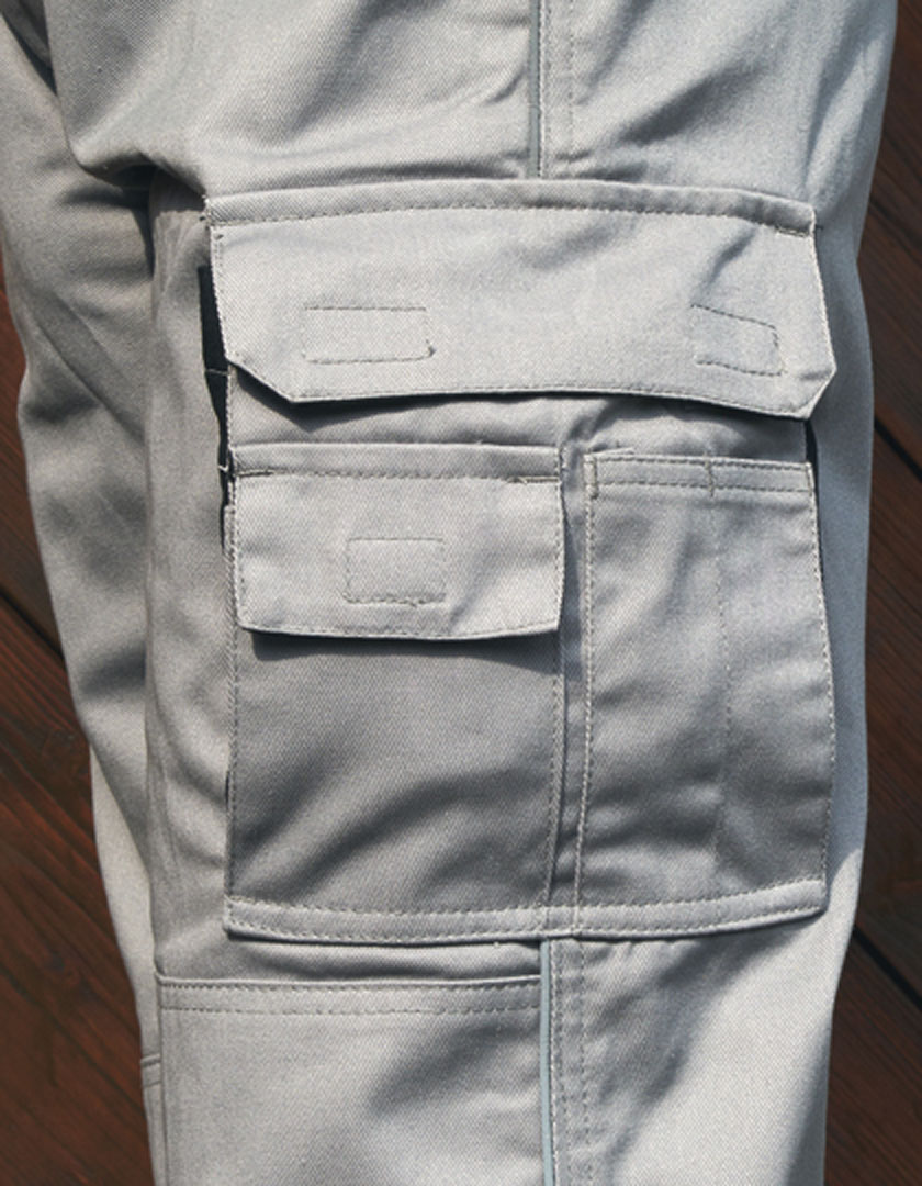 YKK Metall-Reißverschluss, Flexbund mit Gürtelschlaufen, variable KlettOmatic-Systemverschlüsse (Druckknöpfe mit Klettverschluss), Gesäßtaschen mit Innen-Klettverschluss, Sicherheitstasche mit verdecktem Reißverschluss, Beuteltasche mit Handy-/Stift-Fach, Taschen für optionale Kniepolster, Seitennaht mit reflektierender Paspel, Waschbar bis 60 °C