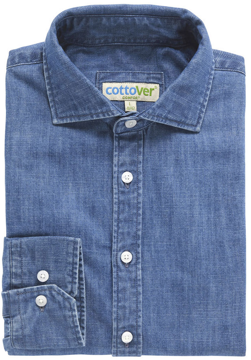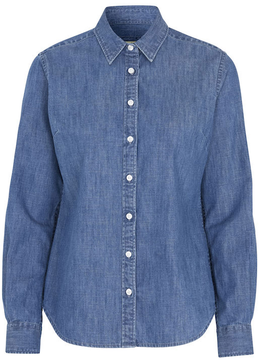 Modernes Denimhemd aus Enzym behandeltem Baumwollstoff für einen weichen Griff. Bei den Damen mit einem Kent Kragen und bei den Herren ein offener Cut Away Kragen.