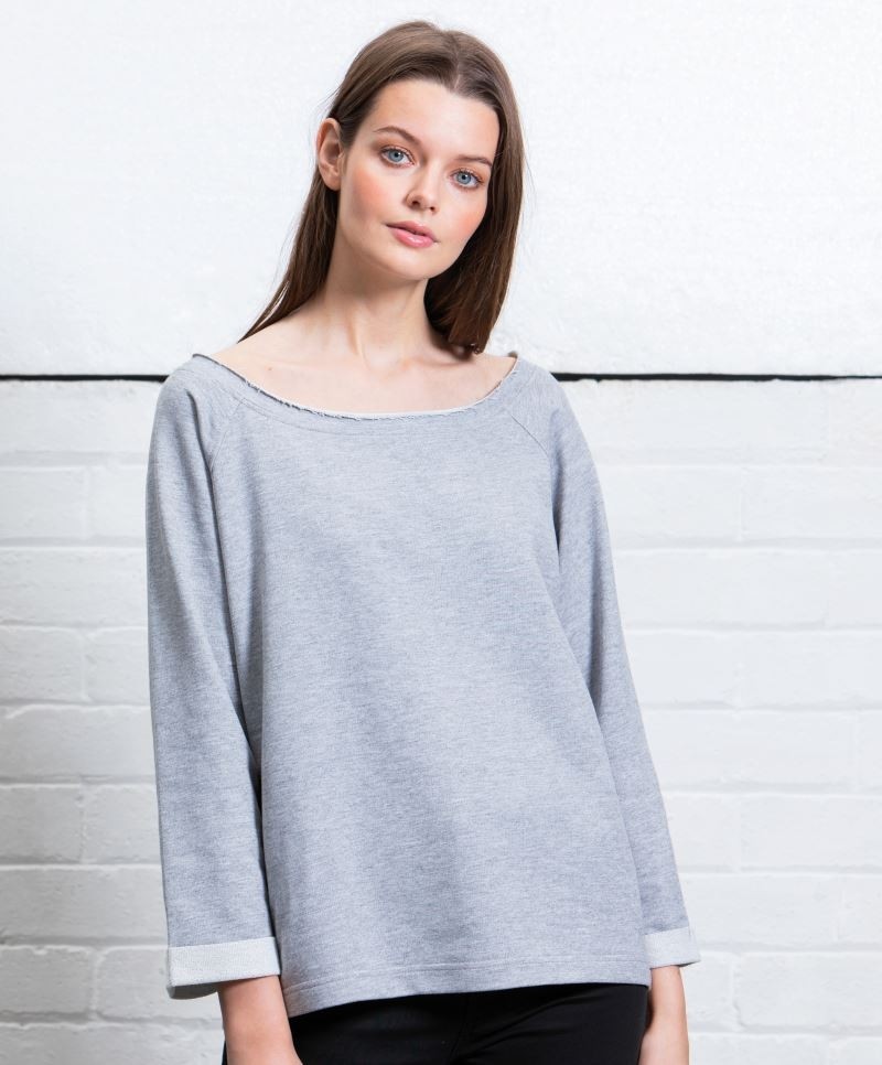 Weiter legerer Schnittt, weites Off-the-Shoulder Styling mit offenen Kanten am Ausschnitt, 3/4 Raglanärmel mit Rollkanten, gerader Saum mit Doppelnaht, TearAway Label