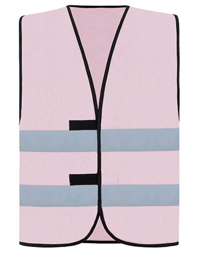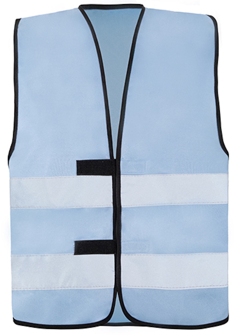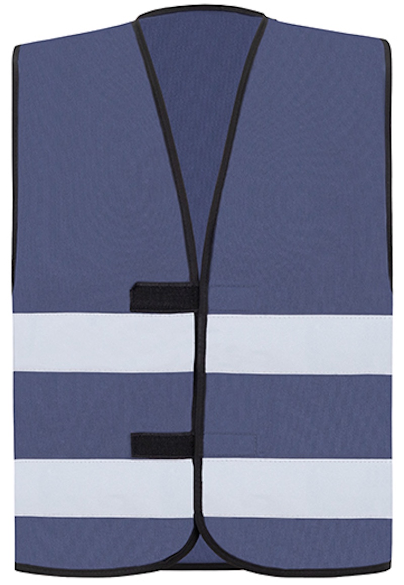 Zwei 5cm breite Reflexstreifen um den Körper, Grössenverstellung durch zwei Klettverschlüsse, umsäumt mit schwarzer Polyestereinfassung