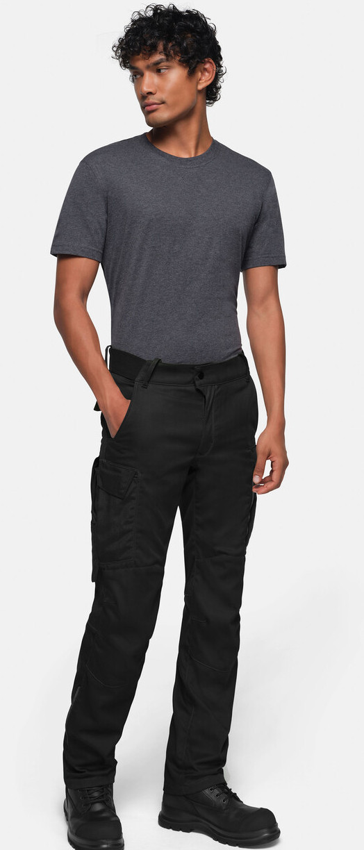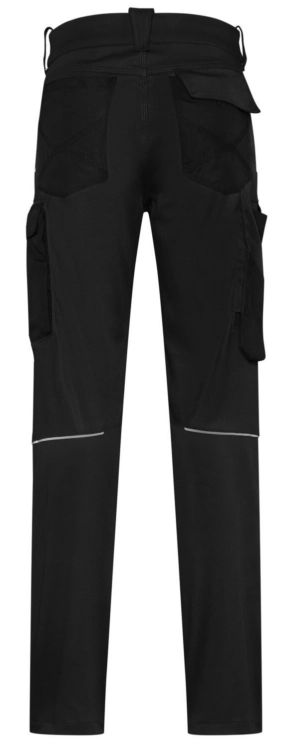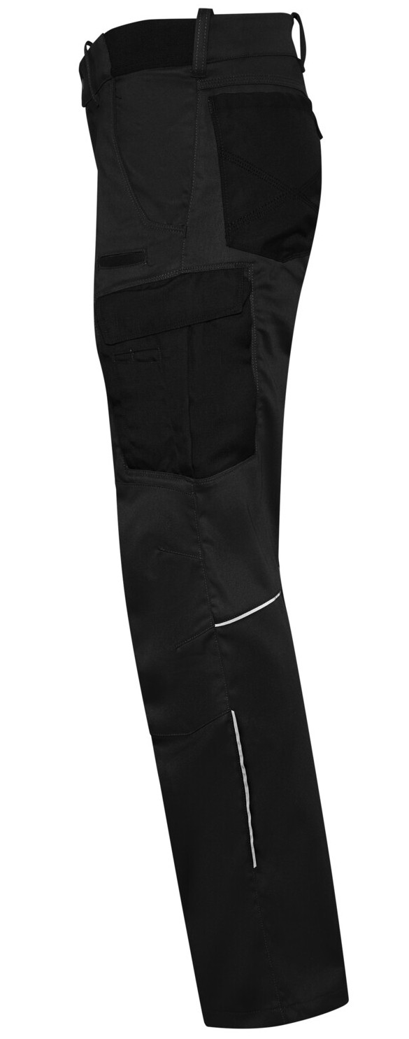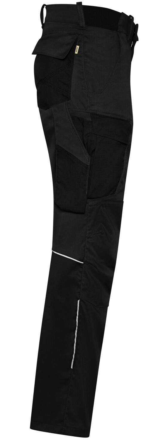Sicherheitsknopf, Reißverschluss, Gürtelschlaufen, eingenähte Reflexbänder und ergonomisch vorgeformte Passform. Zwei Einschubtaschen, rechts mit zusätzlicher Sicherheits-Reißverschlusstasche. Zwei Gesäßtaschen mit Stickerei, rechts mit Patte und Klettverschluss. Zwei Cargotaschen mit multifunktionellen Unterteilungen, verschließbar mit Patten und Reißverschluss an der linken Cargotasche. Aufgesetzte Zollstocktasche auf der rechten Seite. Alle aufgesetzten Taschen aus CORDURA® und alle Reißverschlüsse von YKK®. Besonders strapazierfähiger Materialmix aus Baumwolle, GRS-zertifiziertem, recyceltem Polyester und Elasthan.