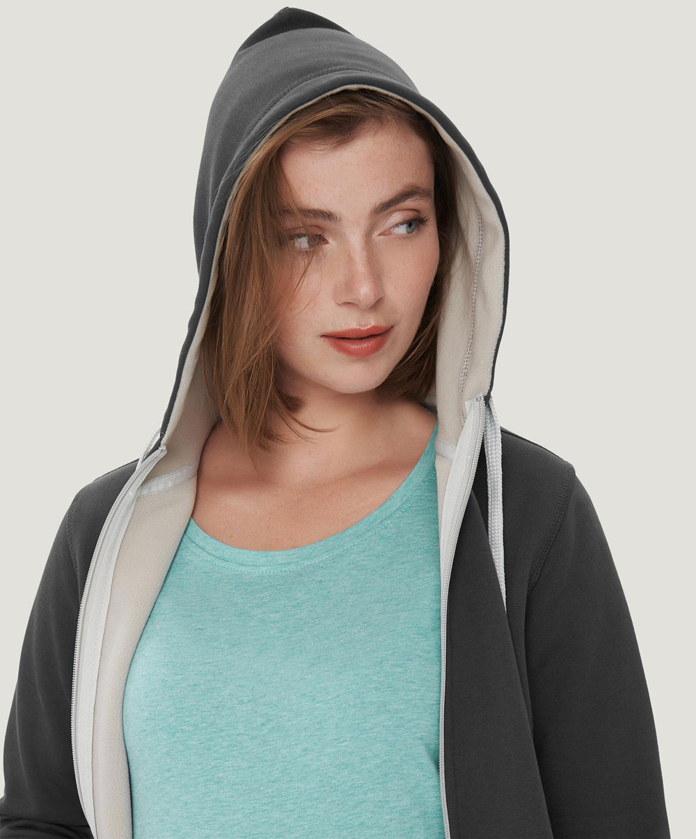 Aufwändig verarbeitete Kapuzenjacke für Damen mit weichem, kontrastfarbigem Microfleece an der Innenseite, hochwertigem, kontrastfarbigem Frontreißverschluss, hochgeschnittener Kapuze mit kontrastfarbiger Kordel und hochwertigen Metallösen. Alle Reißverschlüsse und Ösen von YKK®. Formstabile Rippstrickbündchen mit LYCRA®-Anteil, Einschubtaschen mit Reißverschlüssen, Teilungsnähte für perfekte Passform mit dekorativer Flatlock-Steppung, kontrastfarbiger Halsspiegel und Nackenband. Hergestellt aus laminiertem 2-Lagen-Material mit einer Außenseite aus feinem Single-Jersey aus langstapeliger, gekämmter und ringgesponnener Baumwolle und einer Innenseite aus weichem Microfleece. Gewebtes HAKRO-Necklabel aus hochwertigem Kettsatin mit weichen, ultraschallgeschnittenen Bandkanten für höchsten Tragekomfort und gewebtes HAKRO-Flaglabel an der linken Seitennaht.