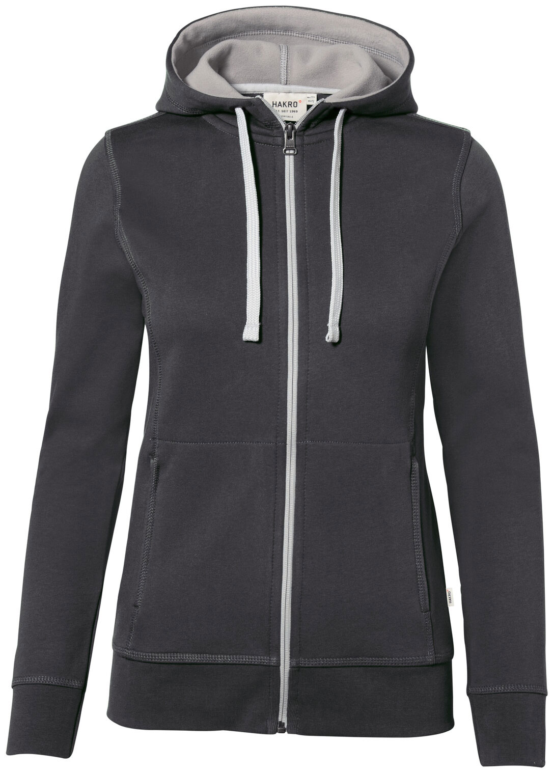 Aufwändig verarbeitete Kapuzenjacke mit weichem, kontrastfarbigem Microfleece an der Innenseite, hochwertigem, kontrastfarbigem Frontreißverschluss, hochgeschnittener Kapuze mit kontrastfarbiger Kordel und hochwertigen Metallösen. Alle Reißverschlüsse und Ösen von YKK®. Formstabile Rippstrickbündchen mit LYCRA®-Anteil, Einschubtaschen mit Reißverschlüssen, Teilungsnähte für perfekte Passform mit dekorativer Flatlock-Steppung, kontrastfarbiger Halsspiegel und Nackenband. Hergestellt aus laminiertem 2-Lagen-Material mit einer Außenseite aus feinem Single-Jersey aus langstapeliger, gekämmter und ringgesponnener Baumwolle und einer Innenseite aus weichem Microfleece. Gewebtes HAKRO-Necklabel aus hochwertigem Kettsatin mit weichen, ultraschallgeschnittenen Bandkanten für höchsten Tragekomfort und gewebtes HAKRO-Flaglabel an der linken Seitennaht.• Material: Single-Jersey-Fleece-Laminat aus 55 % Polyester und 45 % Baumwolle(grau meliert: 75 % Polyester und 25 % Baumwolle)• Gewicht: 340 g/m2• Passform: Comfort Fit• Zertifikate: OEKO-TEX® STANDARD 100• Waschtemperatur: max. 40 °C• Größen: XS-3XL
