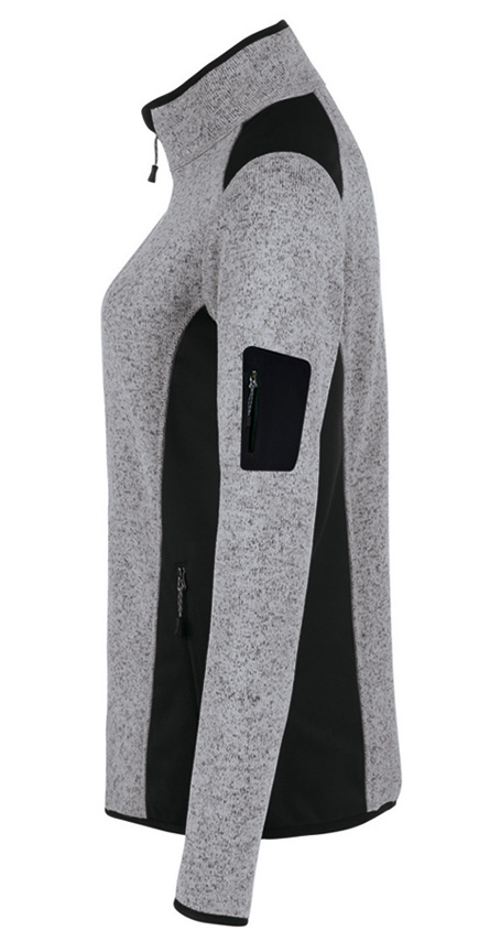 Sportive Strickfleecejacke für Damen mit kontrastfarbigen Einsätzen an den Seiten und Schultern, Teilungsnähten auf Vorder- und Rückenteil für perfekte Passform, hochwertigem, kontrastfarbigem Zwei-Wege-Frontreißverschluss, seitlichen Reißverschlusstaschen, elastischen Saum- und Ärmelbündchen, Reißverschluss-Ärmeltasche am linken Ärmel, Nackenband und Aufhängeband im Nacken. Alle Reißverschlüsse von YKK®. Hergestellt aus atmungsaktivem Strickfleece und leichtem, elastischem Softshell-Material. Gewebtes HAKRO-Necklabel aus hochwertigem Kettsatin mit weichen, ultraschallgeschnittenen Bandkanten für höchsten Tragekomfort und gewebtes HAKRO-Flaglabel an der linken Seitennaht.