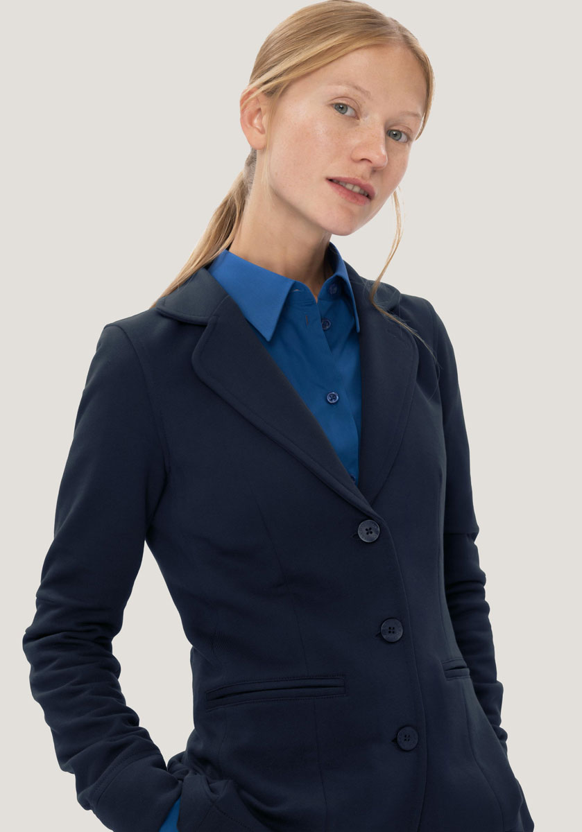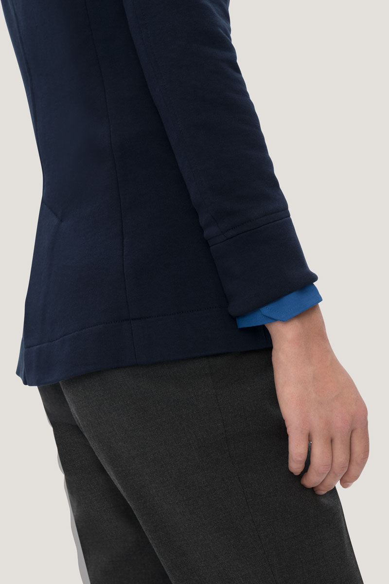 Modisch geschnittener 3-Knopf-Sweatblazer für Damen mit formgebenden Längsnähten für perfekte Passform, Paspeltaschen, Rückenteil mit verdecktem Schlitz, Ärmeln mit Passformabnähern auf Ellbogenhöhe, Teilungsnaht und geschlossener Manschette, 4-Loch-Knöpfen mit gelasertem HAKRO-Schriftzug - über Kreuz vernäht und doppelt verknotet für extrafesten halt -, Teilfutter aus gestreiftem Gewebe im Rücken, nicht angerauter Innenseite (French-Terry) und Metallkettchen als Aufhänger an der Krageninnenseite. Hergestellt aus pflegeleichter Baumwolle-Polyester-Mischung für höchste Ansprüche. Gewebtes HAKRO-Necklabel aus hochwertigem Kettsatin mit weichen, ultraschallgeschnittenen Bandkanten für höchsten Tragekomfort.