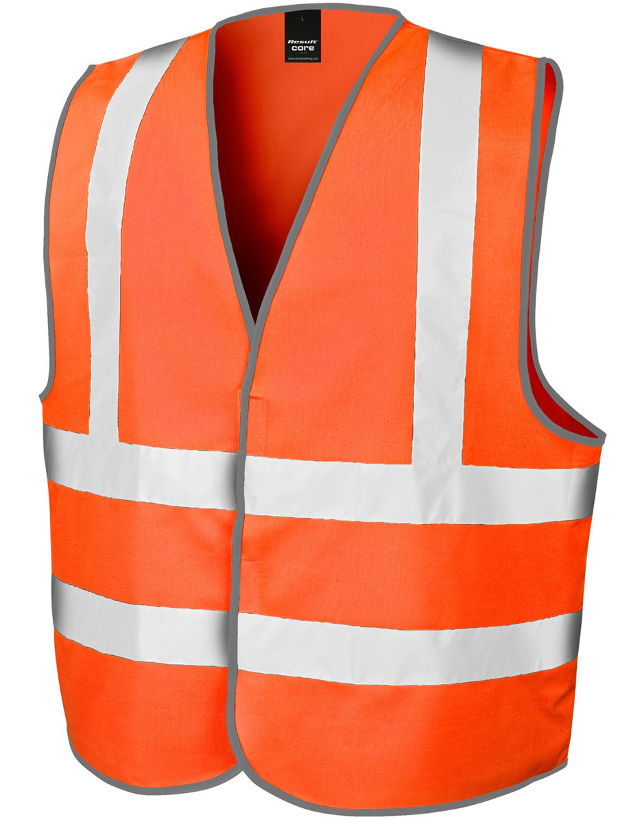 Einfacher, langer, vertikaler Klettverschluss an der Vorderseite, aufgenähte Reflektorstreifen 50 mm breit, lässiger Schnitt für bequemes Tragen über der Tagesbekleidung, Saumnähte mit grauem Polyesterbesatz, Sicherheitsbänder rundum und über den Schultern