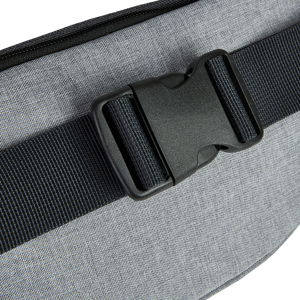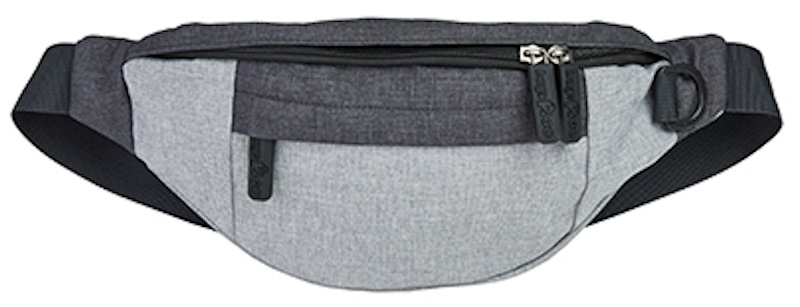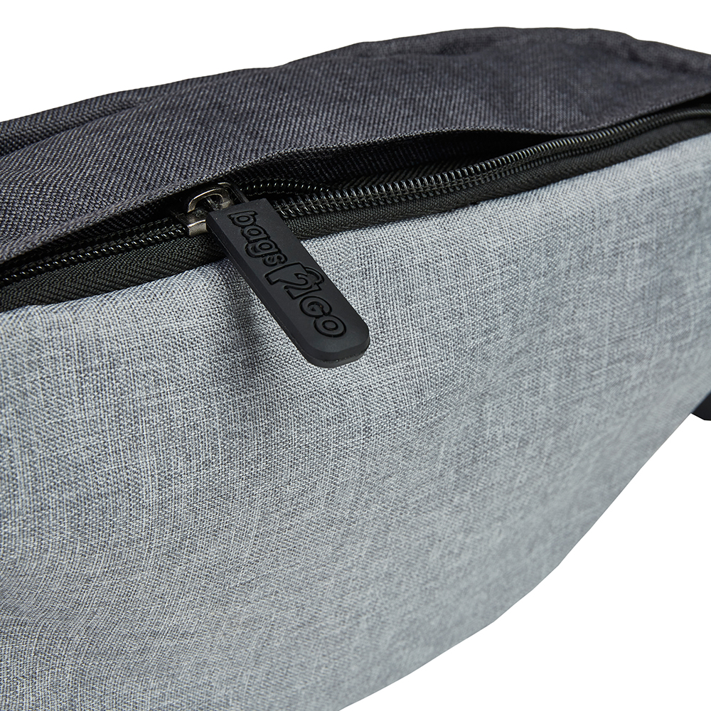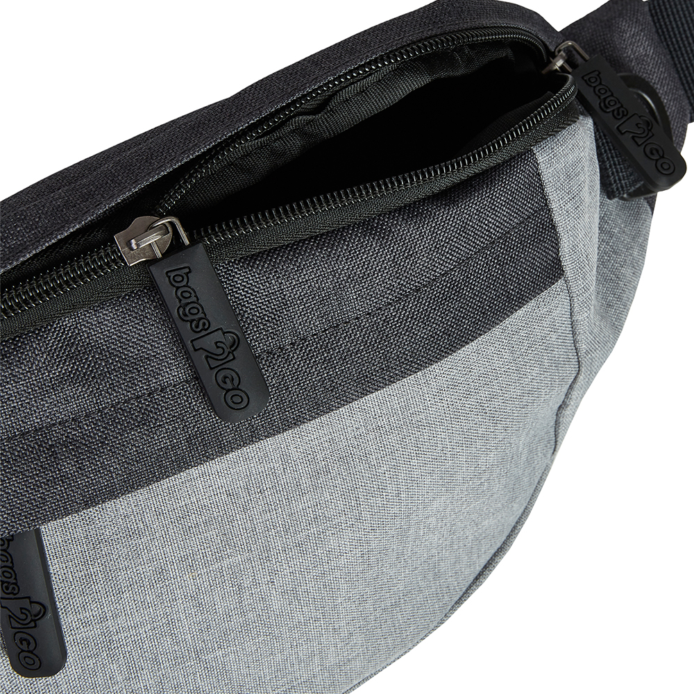 600D Polyester Gürteltasche in dunkel- und hellgraumeliert, Hauptfach mit 2-Wege-Reißverschluss, aufgesetzte Fronttasche mit verdecktem Reißverschluss, seitlicher Kunststoff-D-Ring, lange Reißverschluss-Tasche hinten, dunkelgrauer Tragegurt mit Klick-Verschluss, alle Reißverschlüsse in Schwarz, Gummi-Zipp-Puller mit „bags2GO“-Prägung, Volumen: ca. 4 Liter