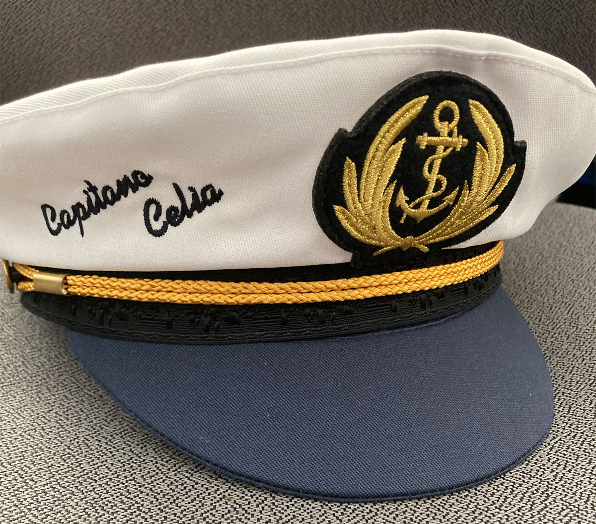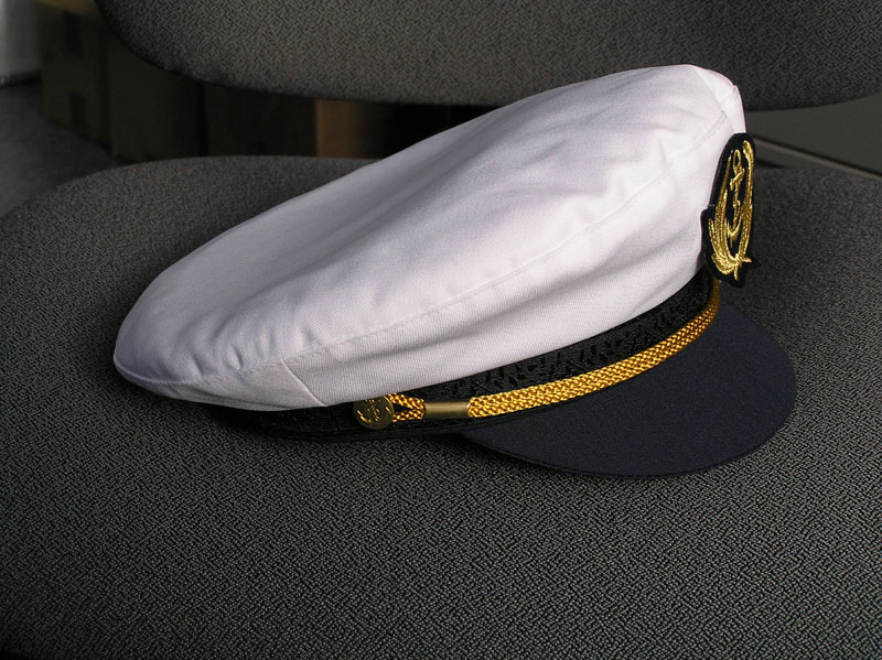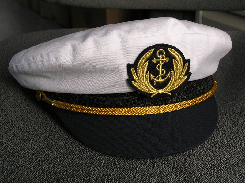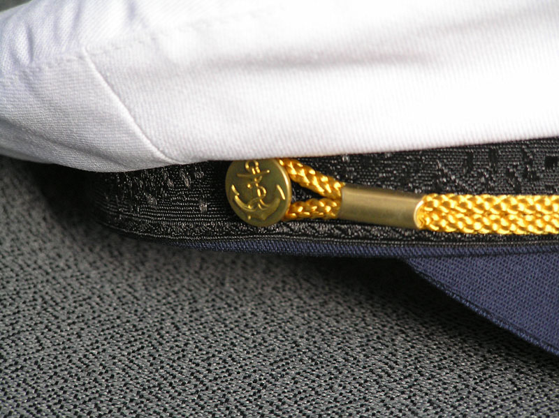Kapitänsmütze mit Stickabzeichen, goldiger Anker und Verzierungen, mit Kordel und Messingknopf.