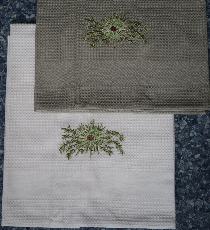 Besticktes Küchentuch in 2 Farben erhältlich. Das Stickerei ist ein mehrfarbiges Motiv einer Distel.