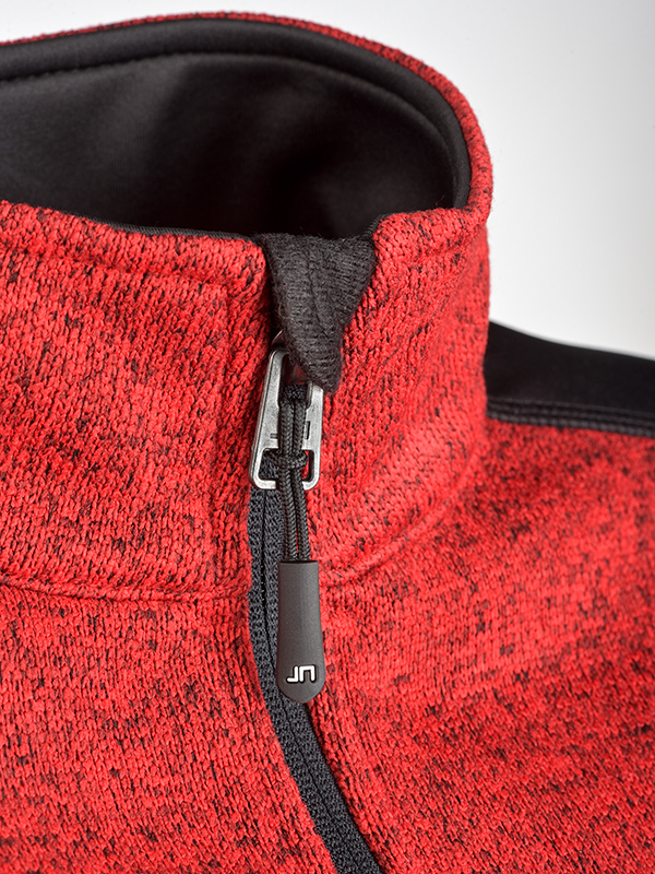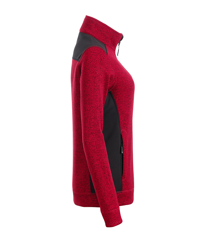 Weiches, wärmendes, pflegeleichtes Material in Melangeoptik, Außenseite Strickoptik, Innenseite flauschig weich angeraut, elastische Softshelleinsätze an Seite, Schulter und Ärmel, 2 Seitentaschen mit verdecktem Reißverschluss, Stehkragen, durchgehend unterlegter Reißverschluss mit Kinnschutz, JN861: leicht tailliert