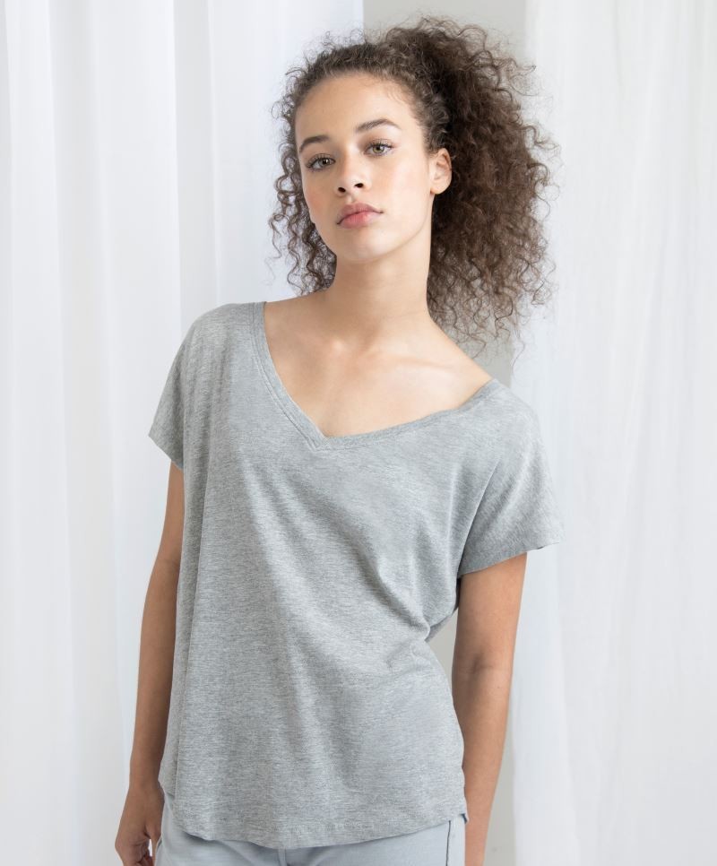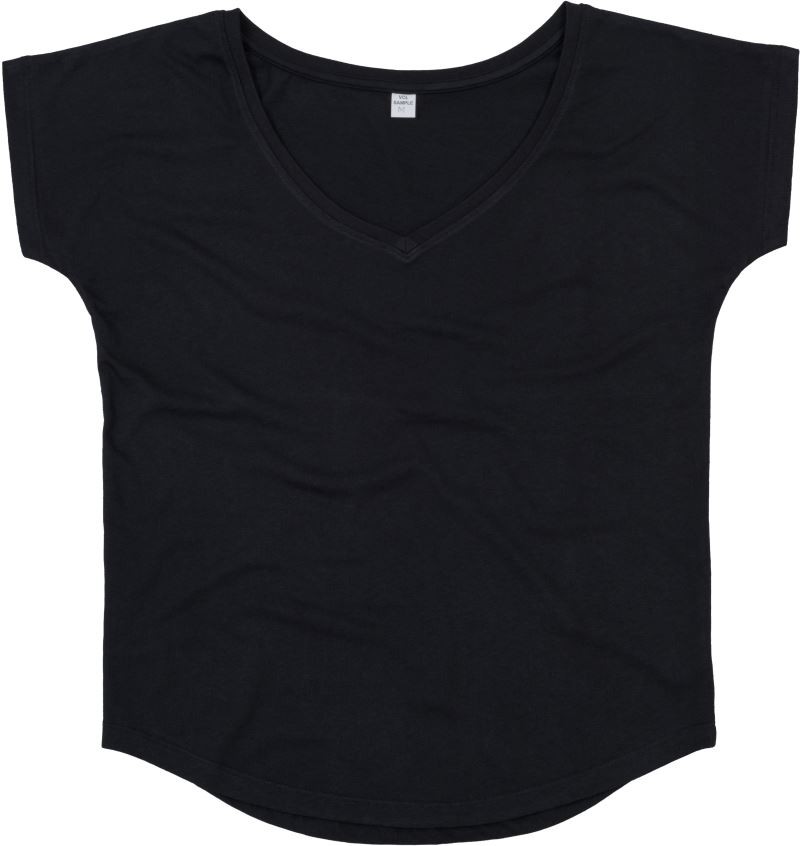 Legerer Schnitt, weiter und tiefer V-Ausschnitt, schmale Halseinfassung, geschwungener Bund, TearAway Label
