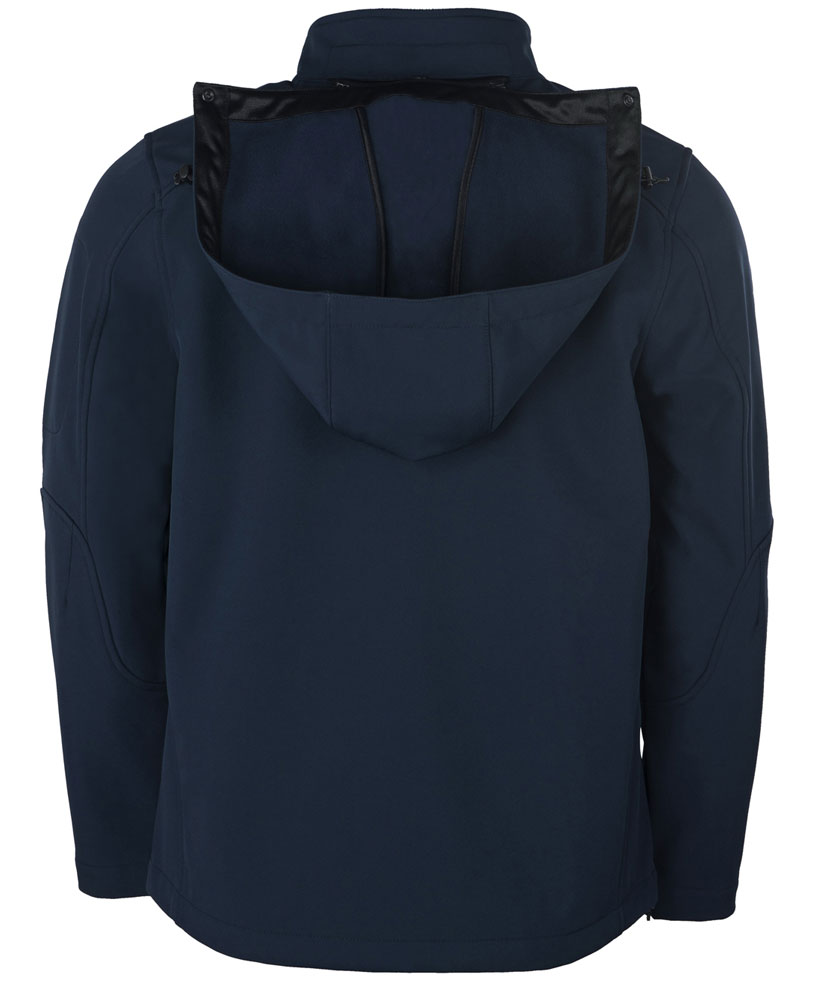 Soft-Shell-Jacke mit abnehmbarer Kapuze Material: 300 g/m², Außenmaterial: 97% Polyester / 3% Elasthan, Innenmaterial: 100% Polyester Weiches, atmungsaktives und witterungsbeständiges Mischgewebe, Innenseiten hochwertiges Micro-Polarfleece, hochwertig verarbeitet, zeitloses Design, modische Passform, 3-lagig, Winddicht, atmungsaktiv und wasserabweisend, 5.000 mm Wassersäule, abnehmbare Kapuze, Kapuzenbefestigung mit Reißverschluss und zwei seitlichen Druckknöpfen, beide Seitentaschen, Ärmeltasche links und die linke Innentasche sind mit Kontrast-Reißverschlüssen, Zipperpullern und Zippergarage ausgestattet, Veredelungszugang in der linken Innenseite, Ärmelweite mit Klettverschluss und Saumweite mit elastischem Kordelzug verstellbar, abgerundeter Saum, 40 °C waschbar Grössen: XS – 3XL