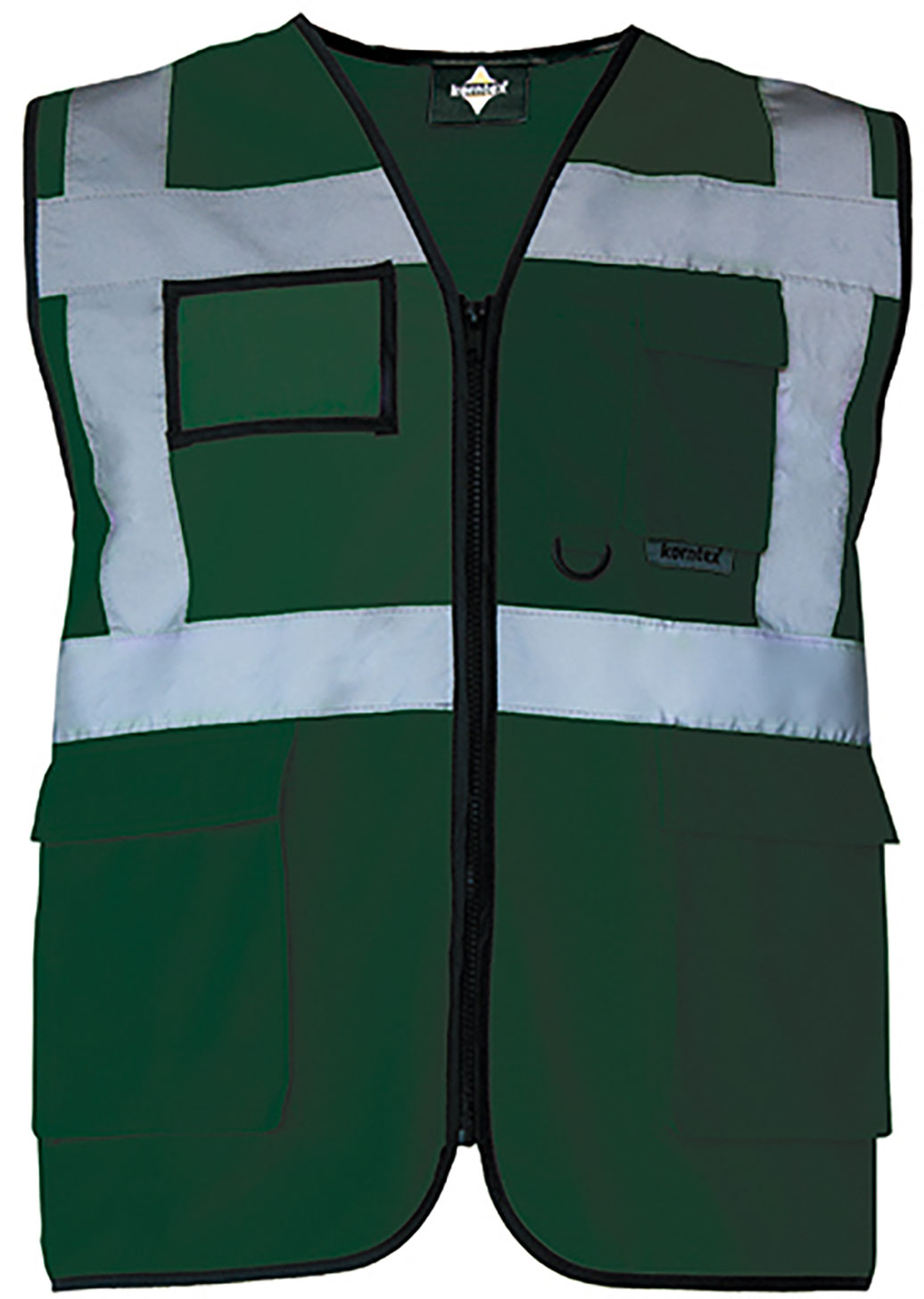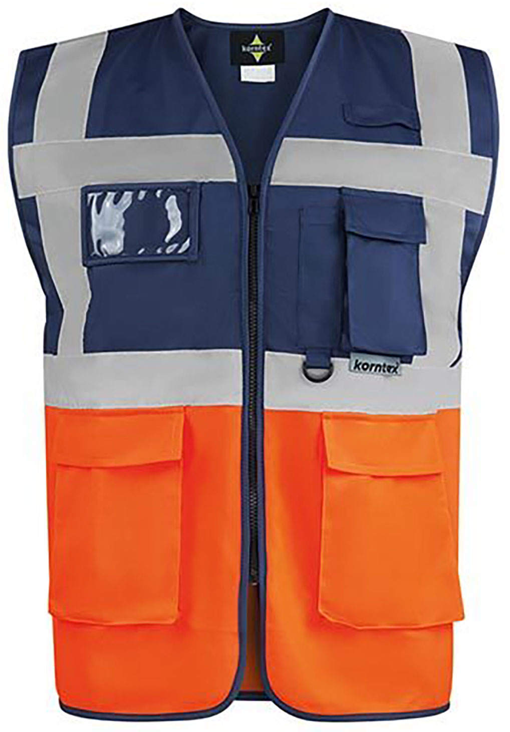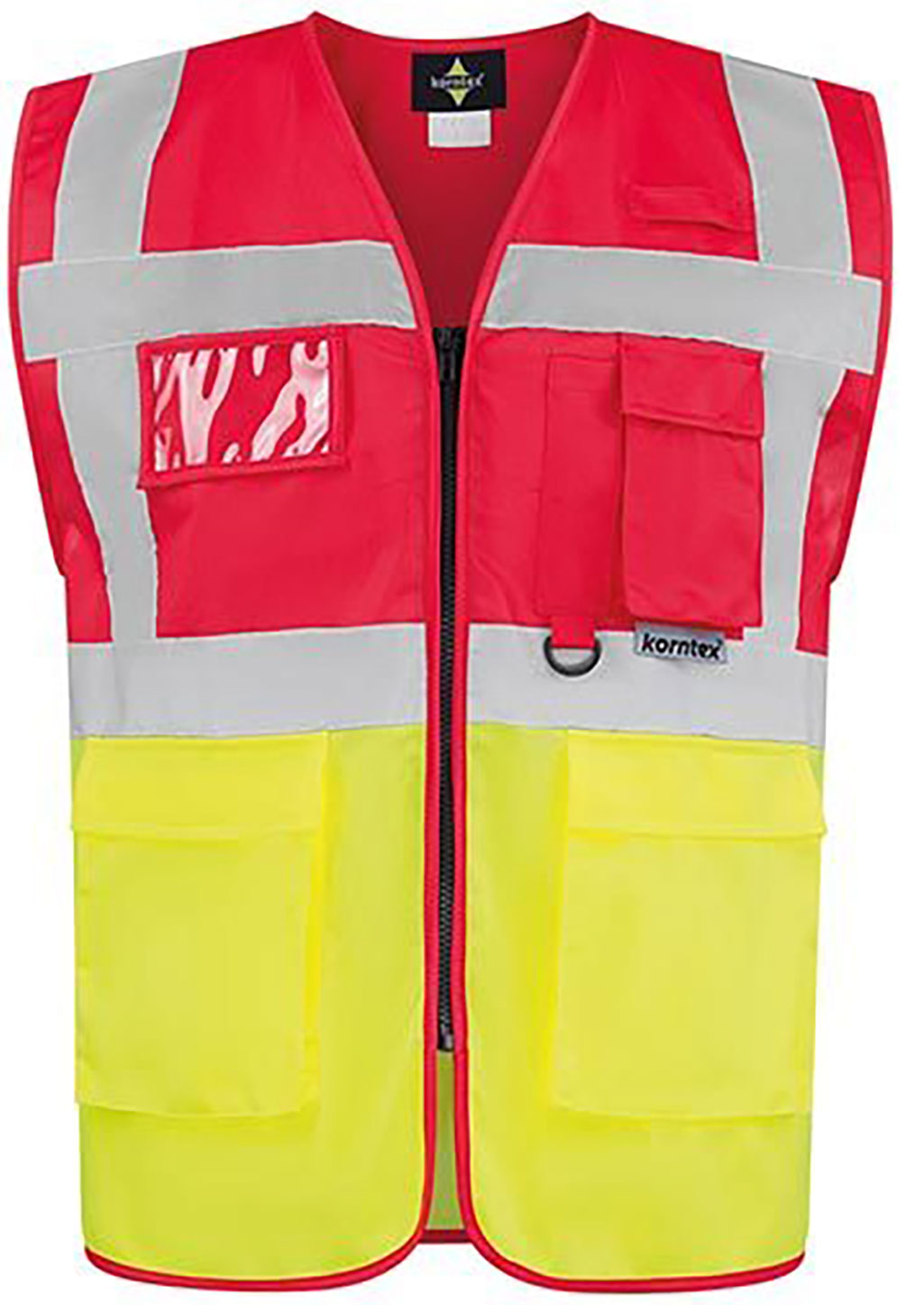 Korntex® Executive Multifunkitons-Warnweste Material: 100% Polyester Zertifiziert nach EN ISO 20471:2013 + A1:2016 Klasse 1, ein 5 cm breiter Reflektionsstreifen um den Körper, zwei 5 cm breite Reflektionsstreifen über der Schulter, durchgehender Reißverschluss vorne, atmungsaktiver Stoff oberhalb der Reflektionsstreifen, hochsichtbarer Stoff unterhalb der Reflektionsstreifen, zwei Taschen mit Klettverschluss-KlappenMultifunktional: Ausweistasche, Smartphone/Funkgeräte-Tasche, Antennenschlaufe, Stiftehalter und Schlüsselring, Hersteller gewährleistet die Reflektionseigenschaft gemäß EN-Norm für 25 Waschgänge bis 40 °C, mit EAN Barcode ausgestattet, Gebrauchsanweisung in den 24 Amtssprachen der EU, einzeln in Polybeutel verpackt Grössen: S - 5XL