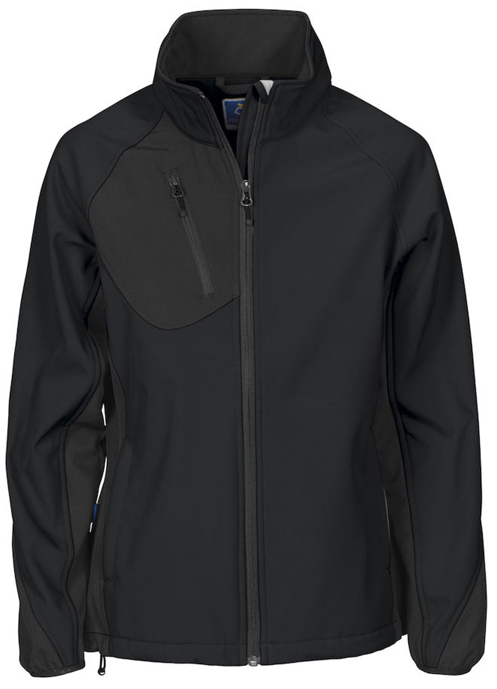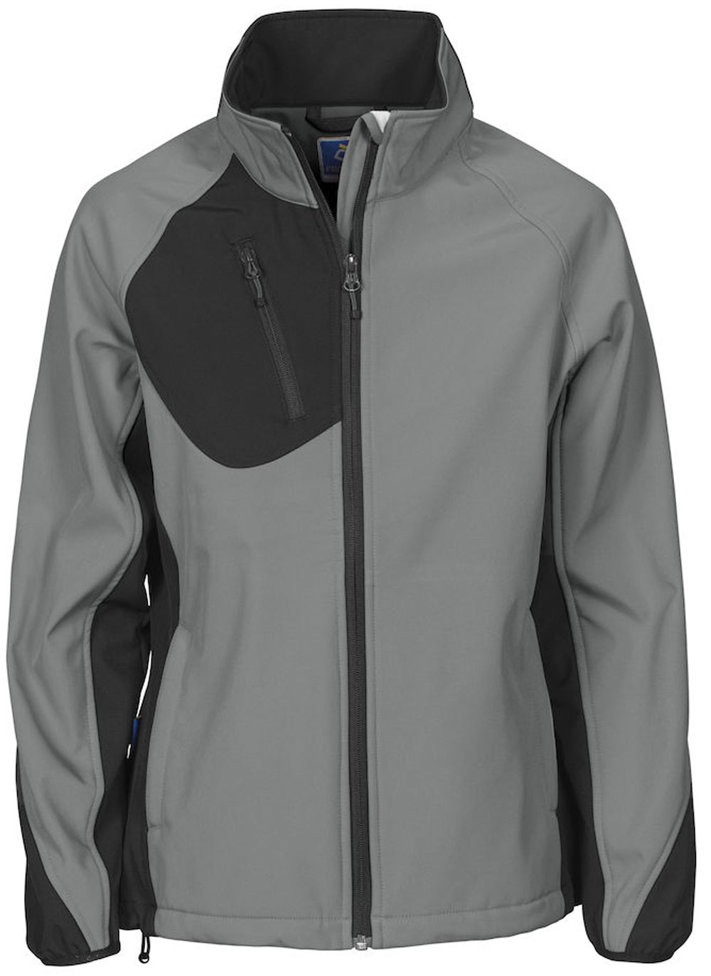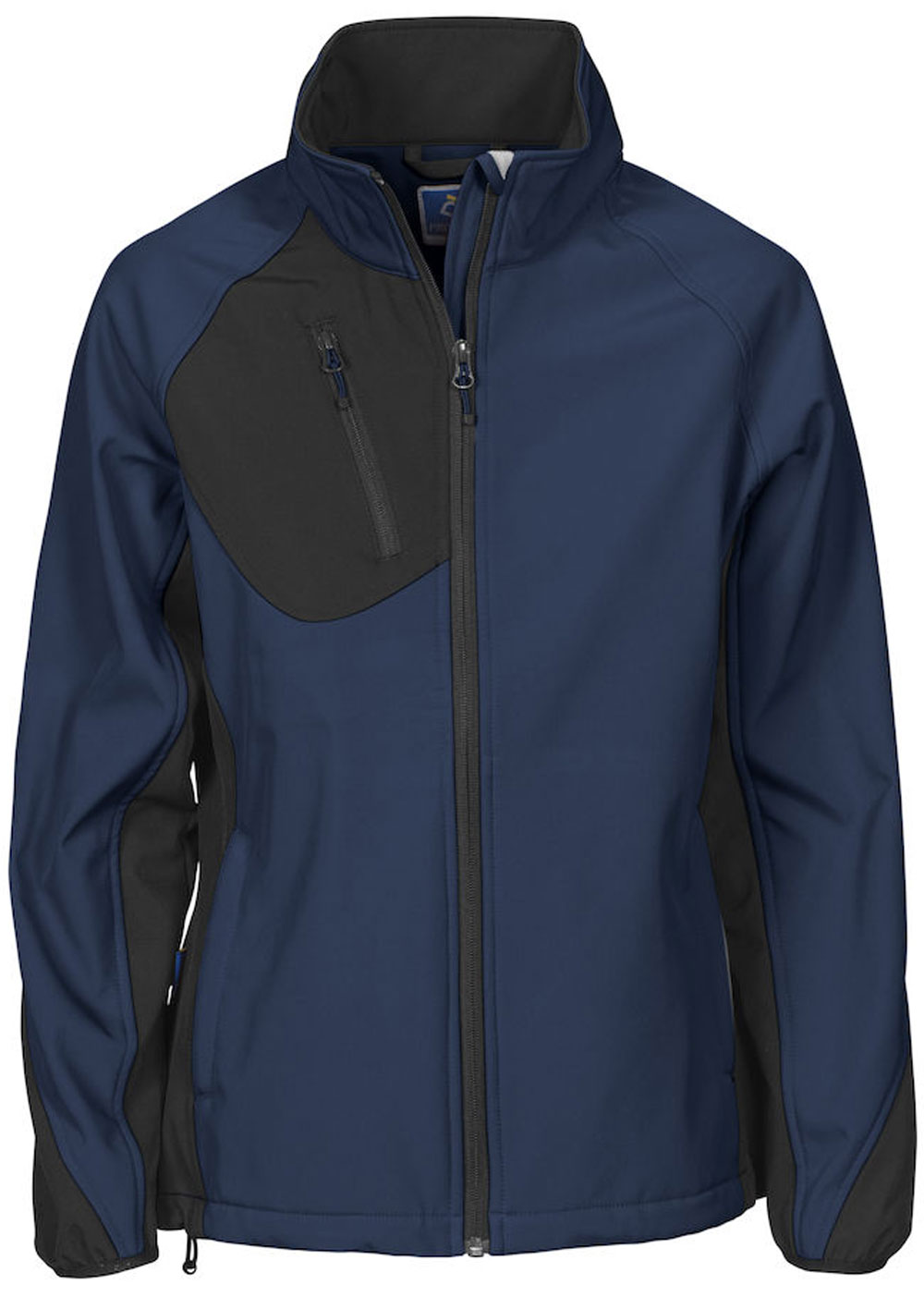 Atmungsaktive Softshell Jacke für Damen. Zwei Seitentaschen und eine Brusttasche mit RV. Zwei Innentaschen. Windschutzleiste innen und Kinnschutz. Verstellbare Taille.