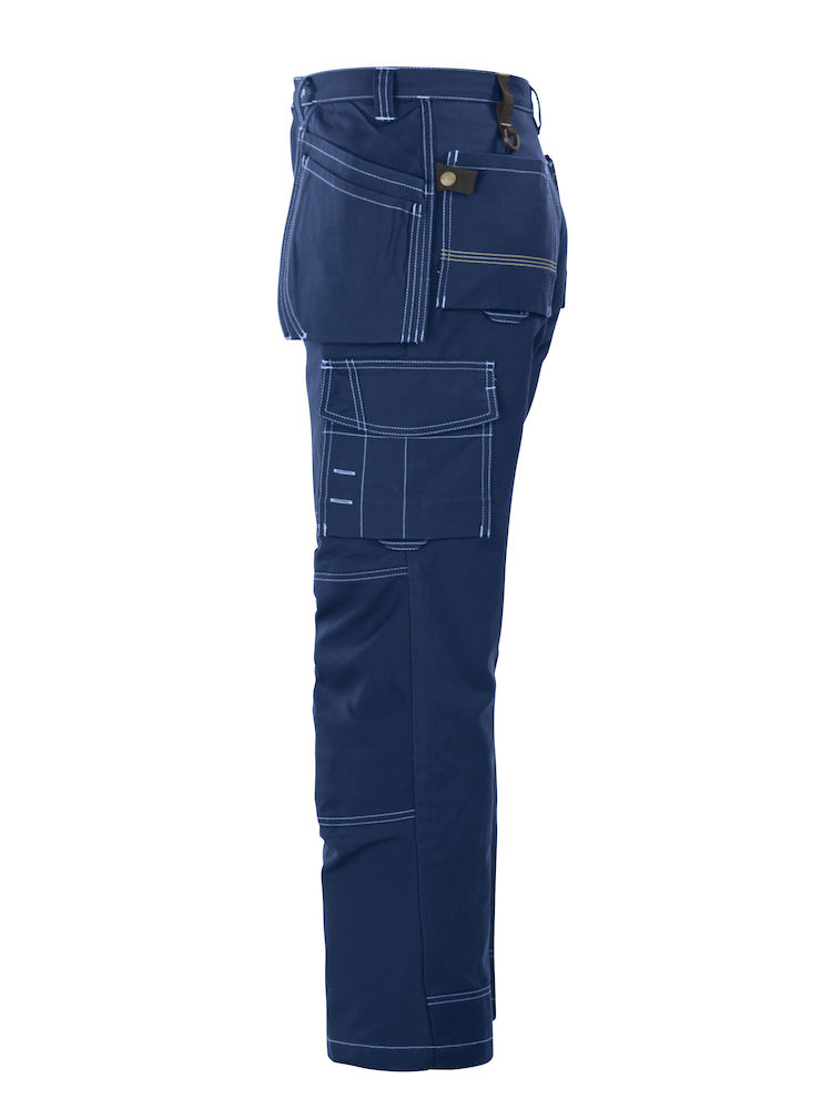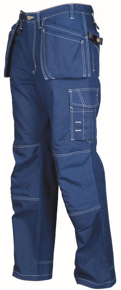 und Werkzeug-Tasche. Zwei verstellbare Hammerhalter. Zwei D-ringe. Zollstock-Tasche mit Werkzeug-Tasche und Messer-Knopf. Knieprotektortaschen aus Cordura® mit Öffnungen auf der Innenseite des Hosenbeins. Höhe der Knieprotektoren verstellbar.