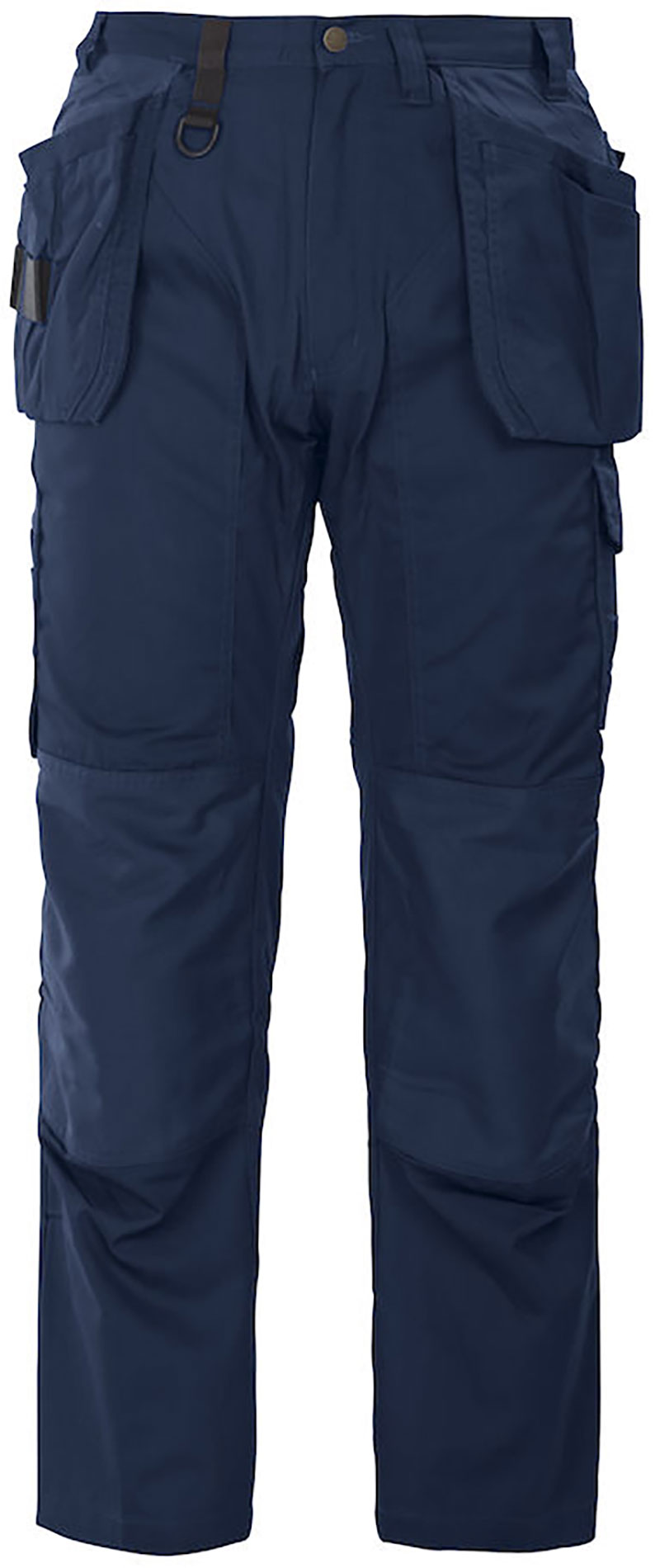 D-Ringe und verstellbare Hammerhalter. Zollstock-Tasche mit Tasche für Werkzeug und Messerknopf. Knieprotektortaschen aus Cordura®, mit Öffnungen auf der Innenseite des Hosenbeins. Höhe der Knieprotektoren verstellbar. Vorgeformte Kniepartien. Hinteres Beinende mit Cordura® verstärkt. Extragrosse Gesäßtaschen. Beintaschen und Seitentaschen vorbereitet für Inbags.