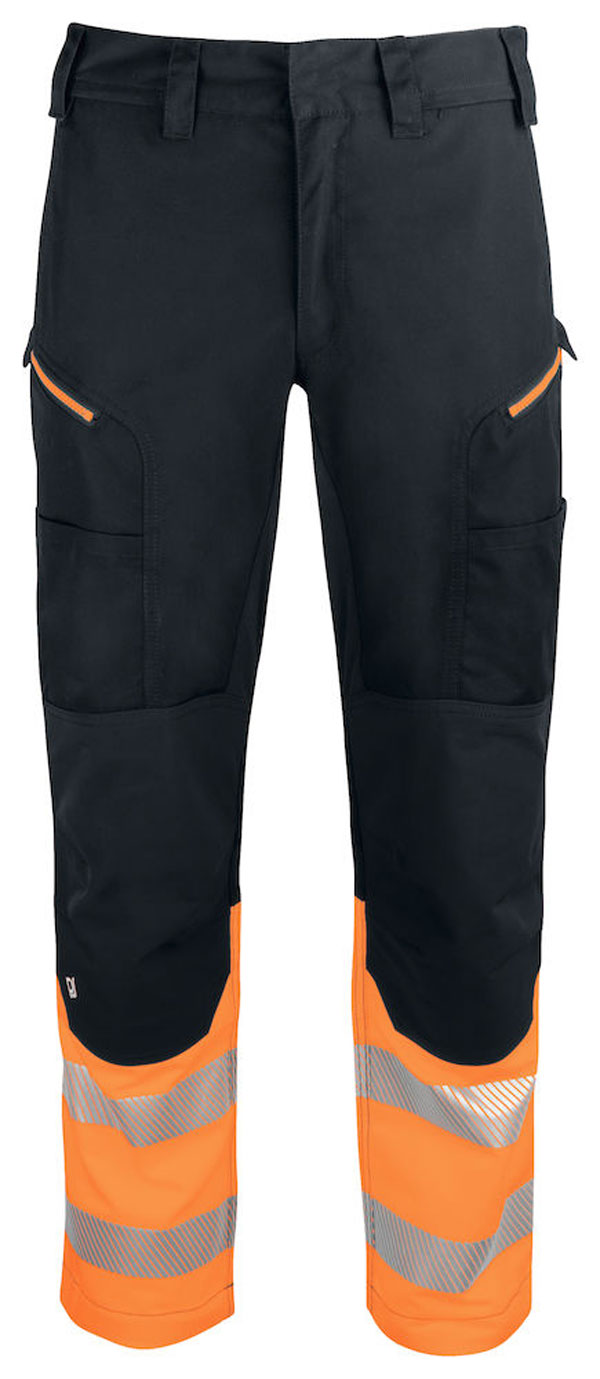 Modern geschnittene Arbeitshose mit Stretch-Einsätzen im Gesäss-, Schritt- und Kniebereichen. Oberschenkeltaschen auf beiden Seiten mit Reissverschluss. Breiter gearbeitete Gürtelschlaufen. Vorbereitungen für Hängetaschen (optional erhältlich PJ 9042). Segmentierte Reflektorstreifen.