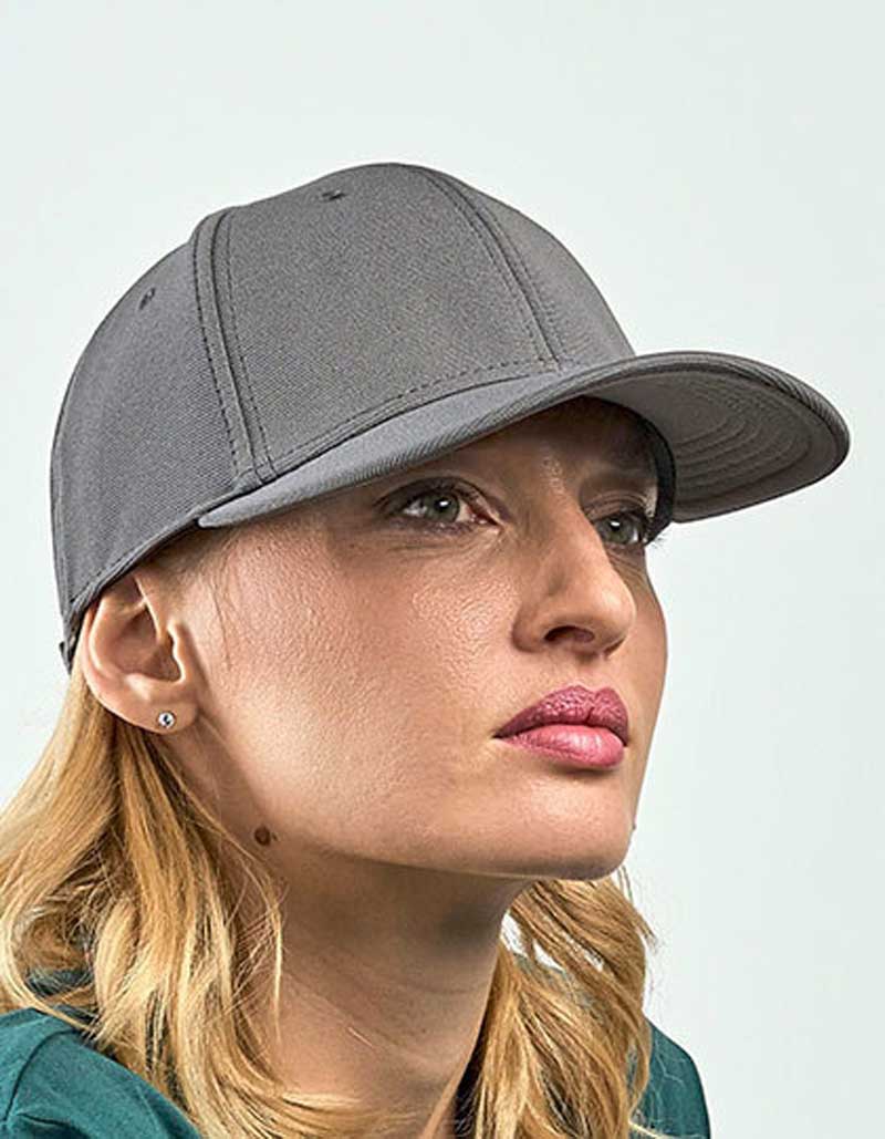 6-Panel-Cap, recycelter Polyester, mittleres Visier, genähte Ösen, sechs Ziernähte auf dem Schirm, dehnbares Elasthan-Material sorgt für eine universelle Passform, Klettverschluss