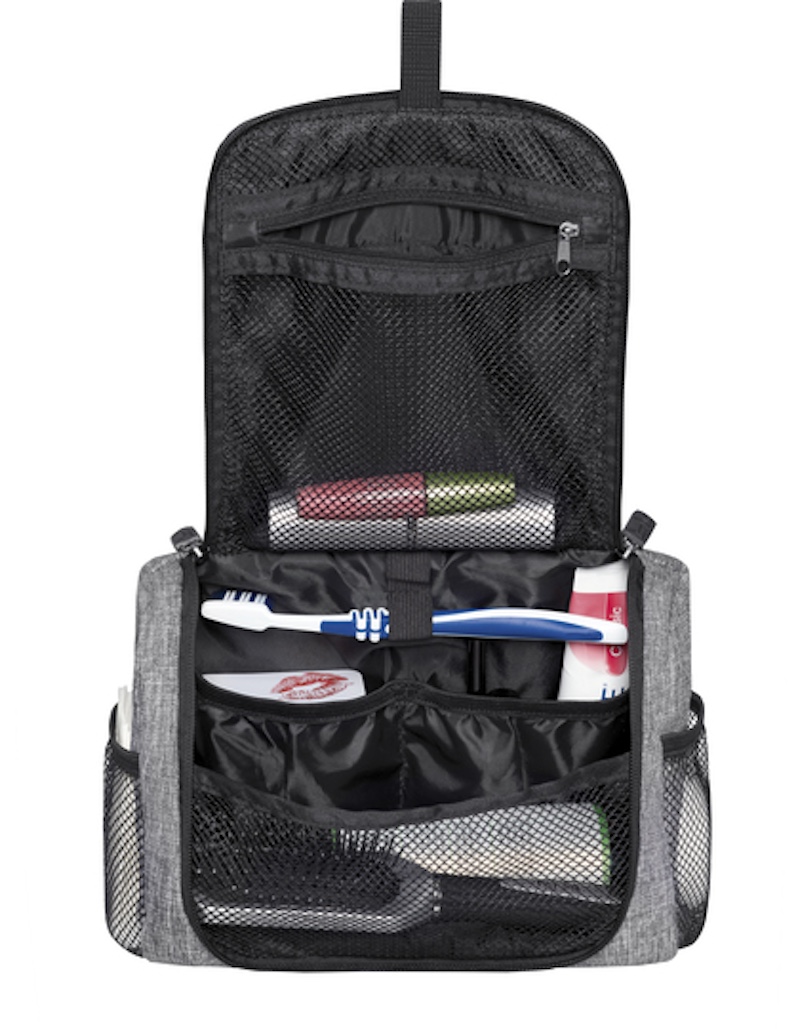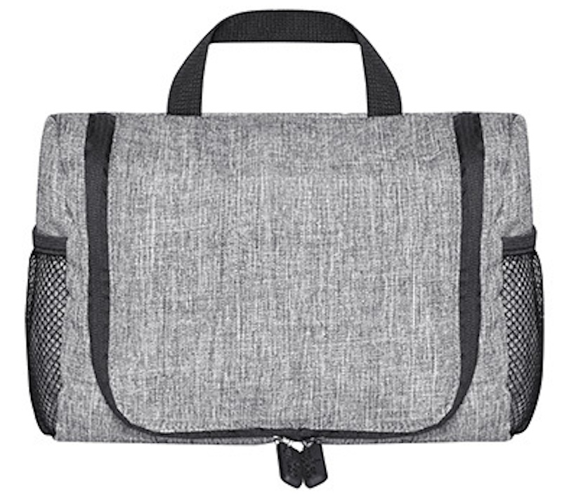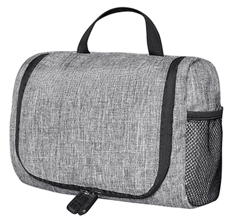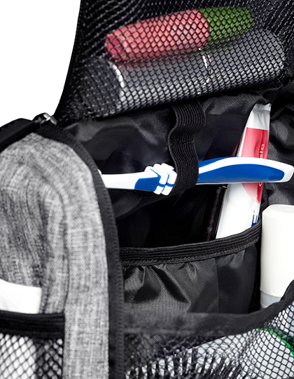 Hauptfach mit langem Reißverschluss in U-Form, Innen zwei Fächer mit Gummizug und ein Reißverschlussfach aus Mesh im Umschlag, alle Reißverschlüsse in Schwarz, Gummi-Zipp-Puller mit „bags2GO“-Prägung, Metallhaken am Umschlag innen zum Aufhängen nach dem Öffnen, Außen zwei Seitentaschen aus Mesh mit Gummizug, Oben liegende Trageschlaufe, Volumen: ca. 6 Liter, Lieferung ohne Inhalt/Deko
