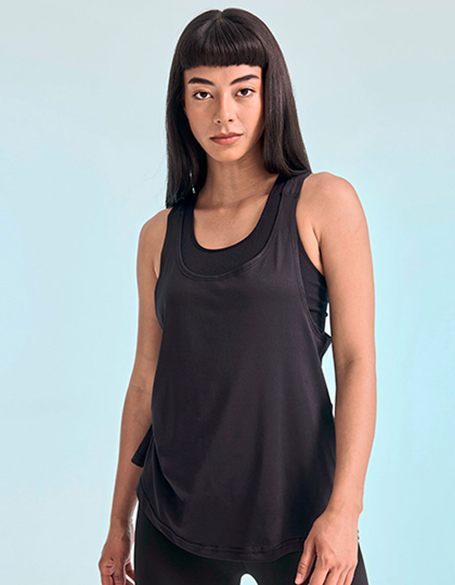 Abreißetikett, gekreuzte Träger im Rücken, tiefer Armausschnitt und Saum, Flatlock-Nähte, U-Ausschnitt, Single-Jersey, 30 °C waschbar