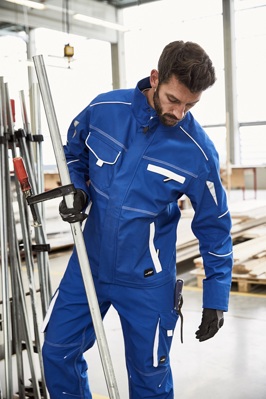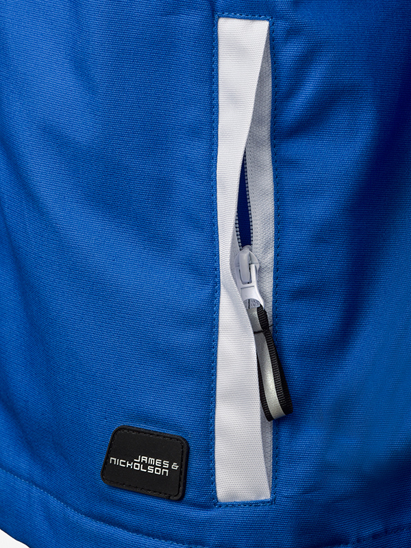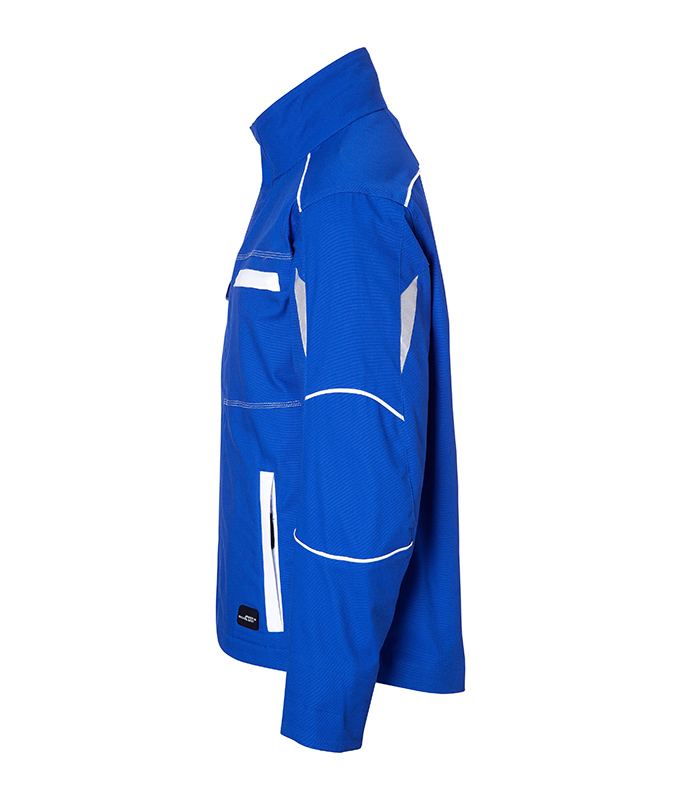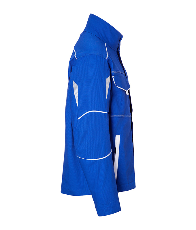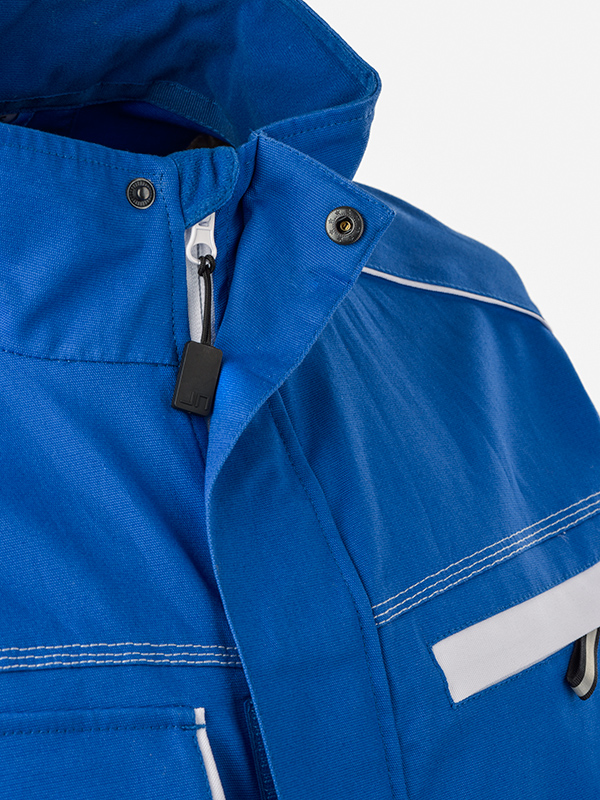 Elastisch, leichte Canvas-Qualität, bequeme Passform durch Elasthananteil und ergonomische Schnittführung, Stehkragen innen mit weichem Fleece, Ergonomisch geformte Ärmel, durchgehend unterlegter Reißverschluss mit Windschutzblende und Kinnschutz, Innenliegende Armbündchen, Seitentaschen, Brusttasche und Innentasche mit Reißverschluss, Brusttasche mit Klappe und Klettverschluss, Handytasche innen, Reflexelemente am Ärmel und im Rückenteil, 60° waschbar, trocknergeeignet, Knöpfe und Reißverschlüsse: Um Beschädigungen am zu bearbeitenden Produkt zu vermeiden sind alle Knöpfe und Reißverschlüsse verdeckt verarbeitet.