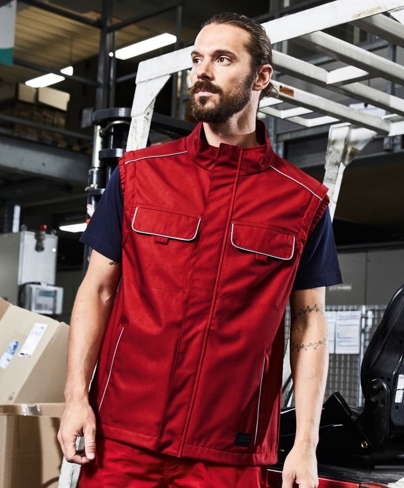 Workwear Softshell Padded Gilet -Solid- Material: 100% Polyester, Wattierung: 100% Polyester, Futter: 100% Polyester Wind- und wasserabweisend (2.000mm Wassersäule), atmungsaktiv und wasserdampfdurchlässig (2.000g/m² in 24h), robustes und strapazierfähiges Softshellmaterial, Stehkragen innen mit weichem Fleece, Reflexelemente an Taschen Schulter und Rückenteil (ohne Schutzfunktion), durchgehend unterlegter Reissverschluss mit Windschutzblende und Kinnschutz, YKK Reissverschlüsse, Seitentaschen und Innentasche mit Reissverschluss, Brusttasche mit losem Taschenbeutel zur einfachen Veredelung, diverse Innentaschen, Knöpfe und Reissverschlüsse verdeckt verabeitet, verlängertes Rückenteil, Veredelungszugang am Rücken Grössen: XS – 6XL