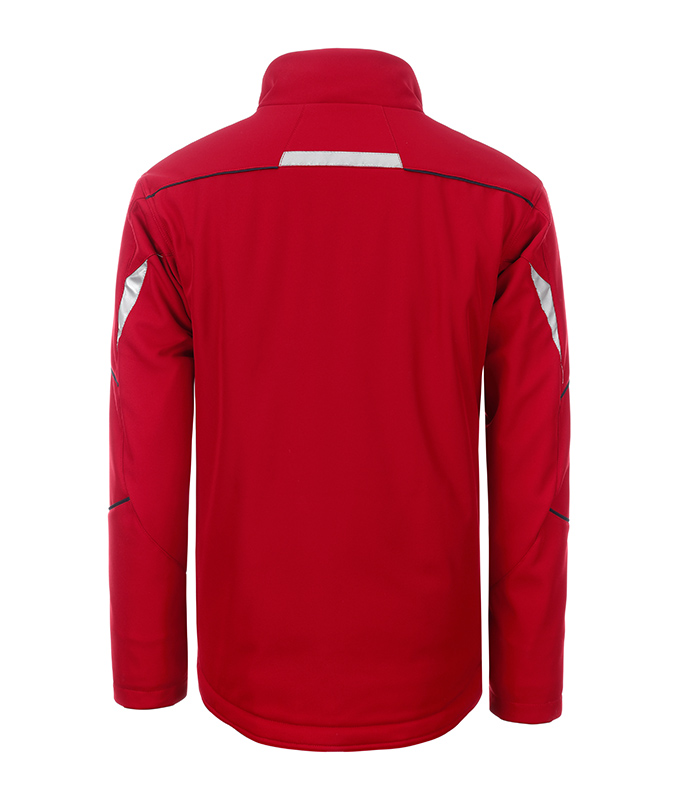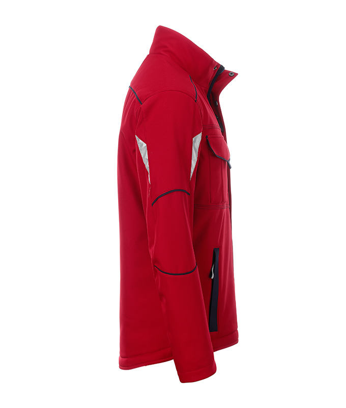 Robustes strapazierfähiges Softshellmaterial, Wind- und wasserabweisend (2.000 mm Wassersäule), Atmungsaktiv und wasserdampfdurchlässig (2.000 g/m²/24h), Stehkragen innen mit weichem Fleece, Ergonomisch geformte Ärmel, verlängertes Rückenteil, Innenliegende wärmende Armbündchen, Durchgehend unterlegter Reißverschluss mit Windschutzblende und Kinnschutz, Seitentaschen, Brusttasche und Innentasche mit Reißverschluss, Brusttasche mit Klappe, Handytasche innen, Reflexelemente an Arm und Rückenteil, Reißverschluss zur Rückenveredelung, Knöpfe und Reißverschlüsse: Um Beschädigungen am zu bearbeitenden Produkt zu vermeiden, sind alle Knöpfe und Reißverschlüsse verdeckt verarbeitet.