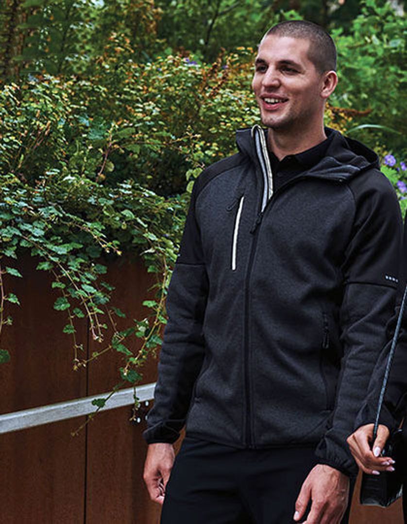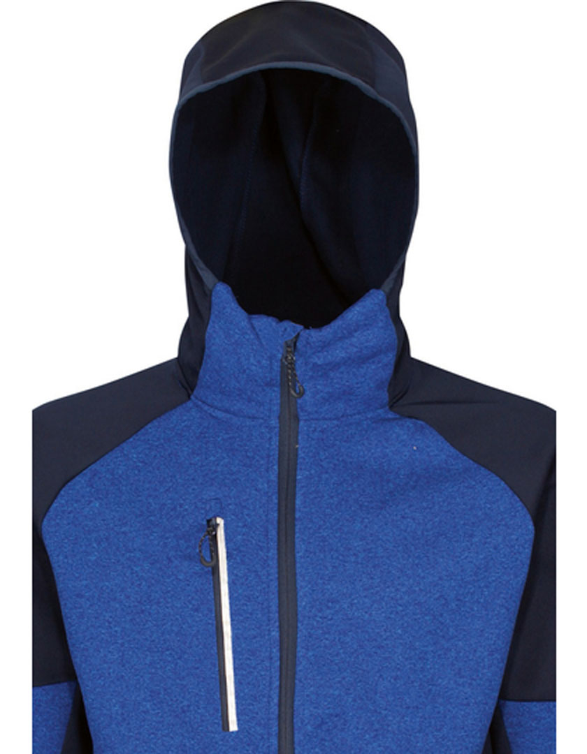 Warmes meliertes Strick-Vlies mit Extol-Stretch-Seiten, Kapuze und Einsätzen im Achselbereich, RFID-Schutz an der Brusttasche für zusätzliche Sicherheit, angedeutete Kapuze und Stretch-Bindung an Kapuzenöffnung, Saum und Ärmelabschlüssen mit Daumenloch, zwei tief angesetzte Reißverschluss-Taschen und eine Reißverschluss-Brusttasche, Kinnschutz, reflektierende Details, 40 °C waschbar